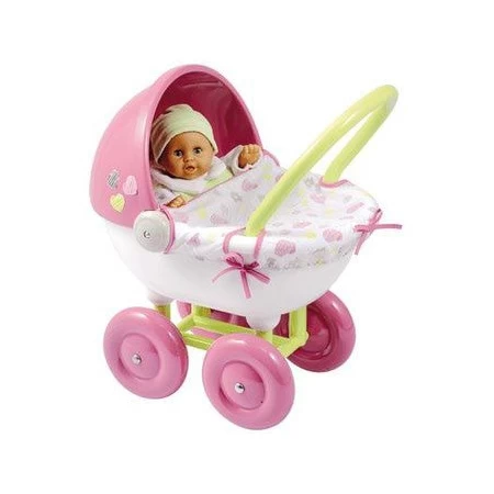 Landau poupée avec châssis en tube métallique, coque et panier en plastique. Capote rabattable. Hauteur poignée : 74 cm. Pour nettoyer le tissu, utiliser uniquement une éponge très légèrement humidifiée d’eau. Sans poupée. Dès 3 ans